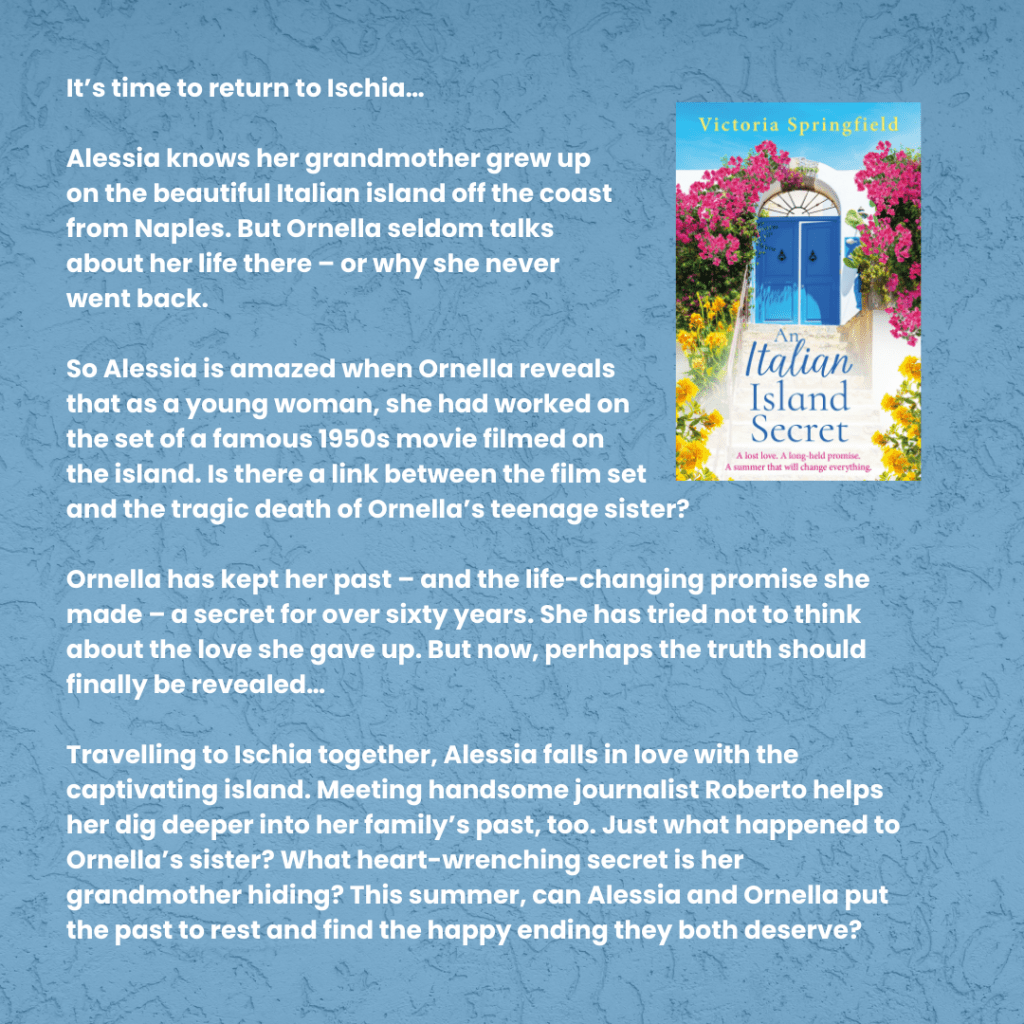 Alessia knows her grandmother grew up on the beautiful Italian island off the coast from Naples. But Ornella seldom talks about her life there – or why she never went back. So Alessia is amazed when Ornella reveals that as a young woman, she had worked on the set of a famous 1950s movie filmed on the island. Is there a link between the film set and the tragic death of Ornella’s teenage sister?