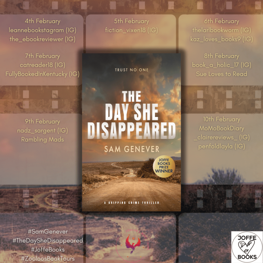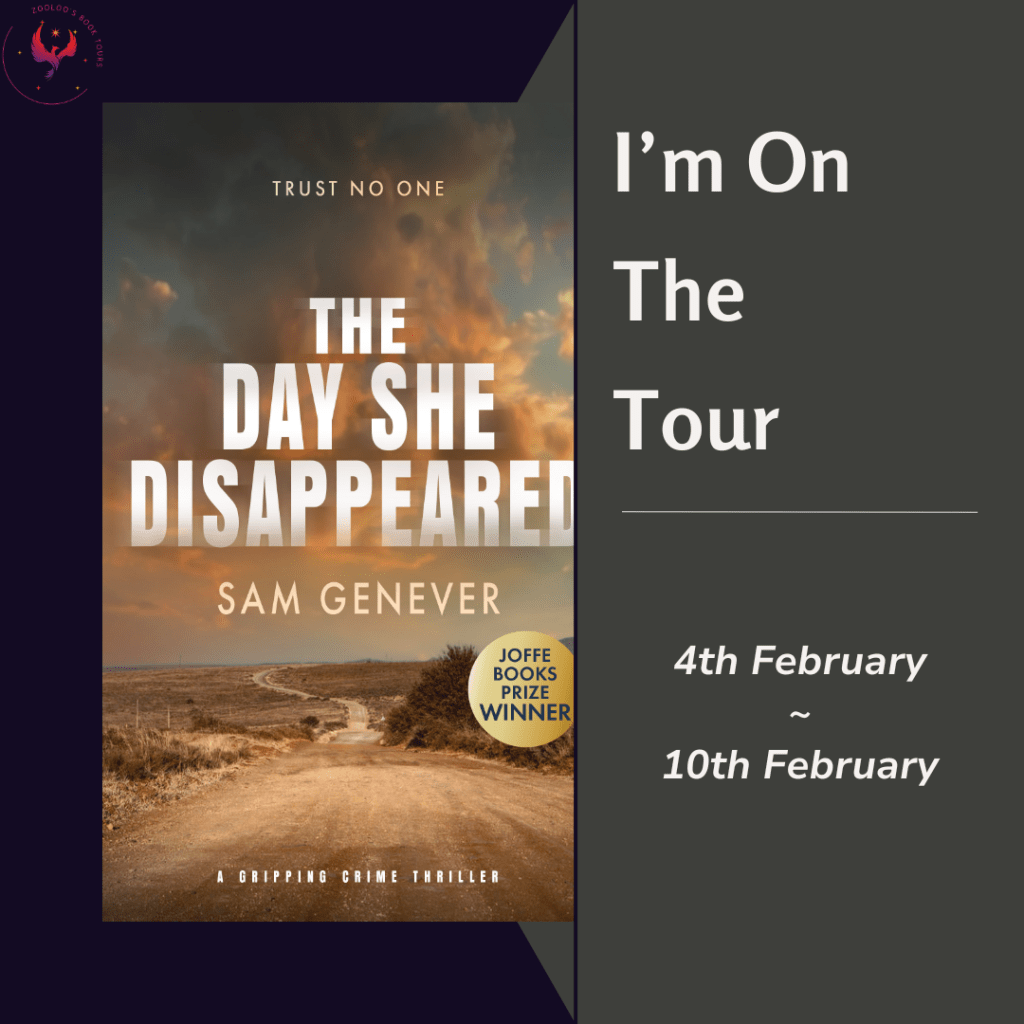 The book tour for The Day She Disappeared by Sam Genever runs from 4 to 10 February and you can find out more about the tour on Zooloo’s Book Tours.