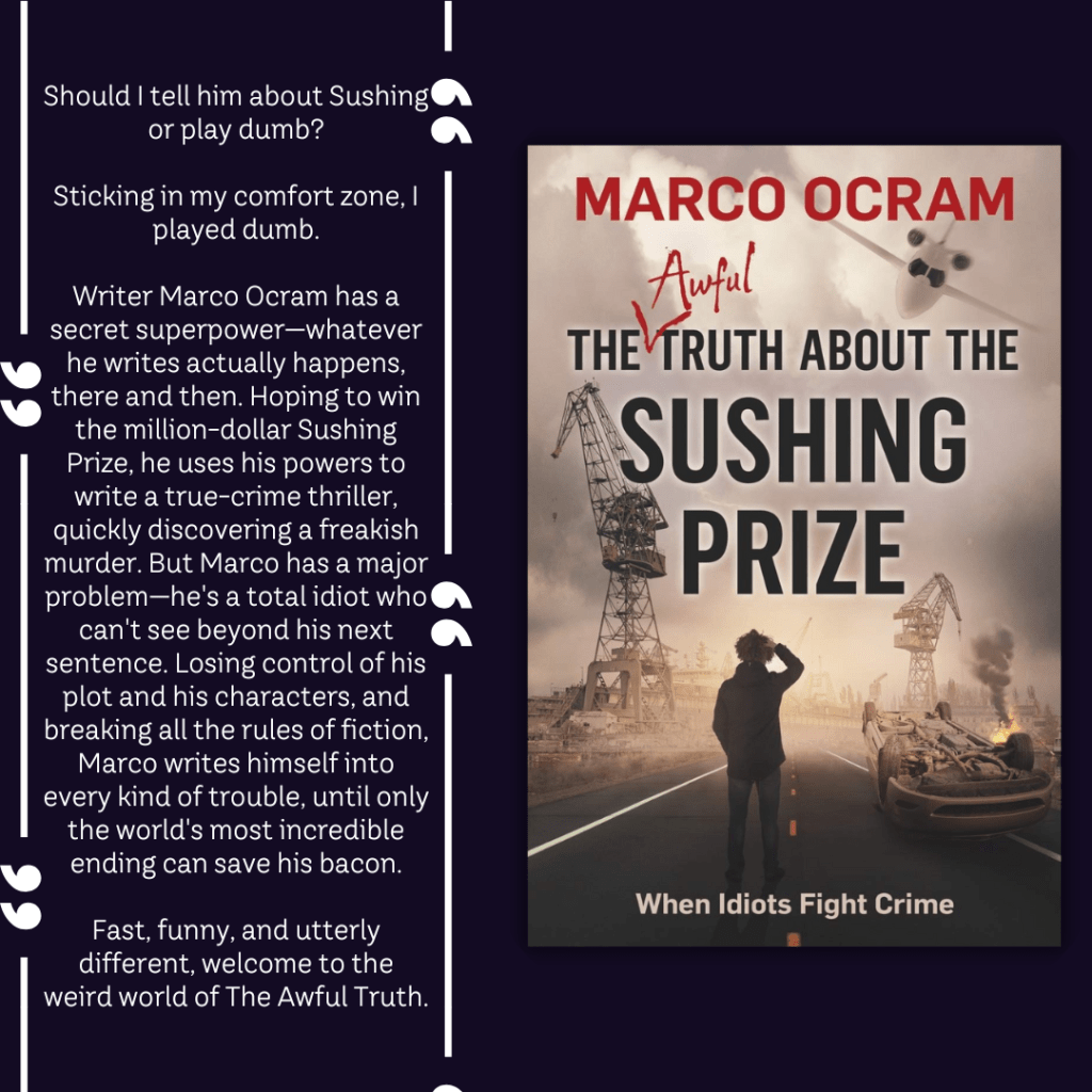 The book follows Marco Ocram, both the author and the protagonist, who possesses a ridiculous but brilliant superpower: whatever he writes instantly becomes reality. The problem? Marco is an idiot. A well-meaning, egotistical, totally clueless idiot who stumbles through his own plot with hilarious results. His sidekick, Como, tries (and often fails) to keep things on track as the two unravel a bizarre murder mystery and chase the prestigious Sushing Prize.