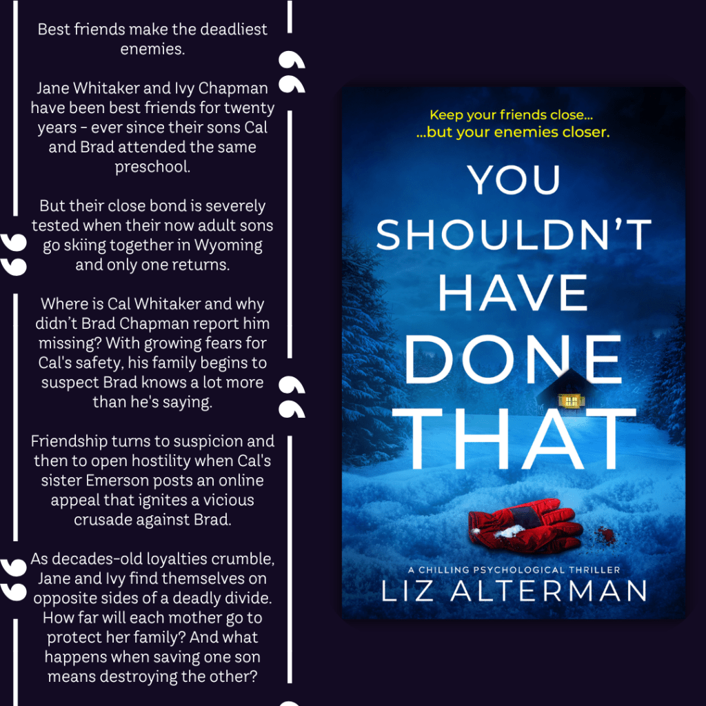 #LizAlterman #YouShouldntHaveDoneThat #InkubatorBooks #ZooloosBookTours #VirtualBookTour #PsychologicalThriller #BookReview