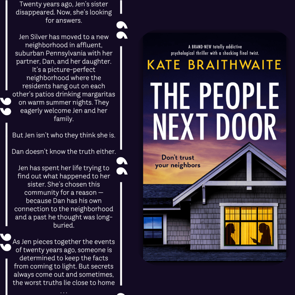 The People Next Door by Kate Braithwaite is one of those psychological thrillers that gets under your skin and doesn’t let go. From the very first page, I was drawn into the web of secrets and lies surrounding Jen, a woman searching for answers about her sister’s mysterious disappearance two decades ago. As Jen settles into a seemingly perfect suburban neighborhood, Braithwaite masterfully builds an atmosphere of tension and unease, making you question every character and every interaction.