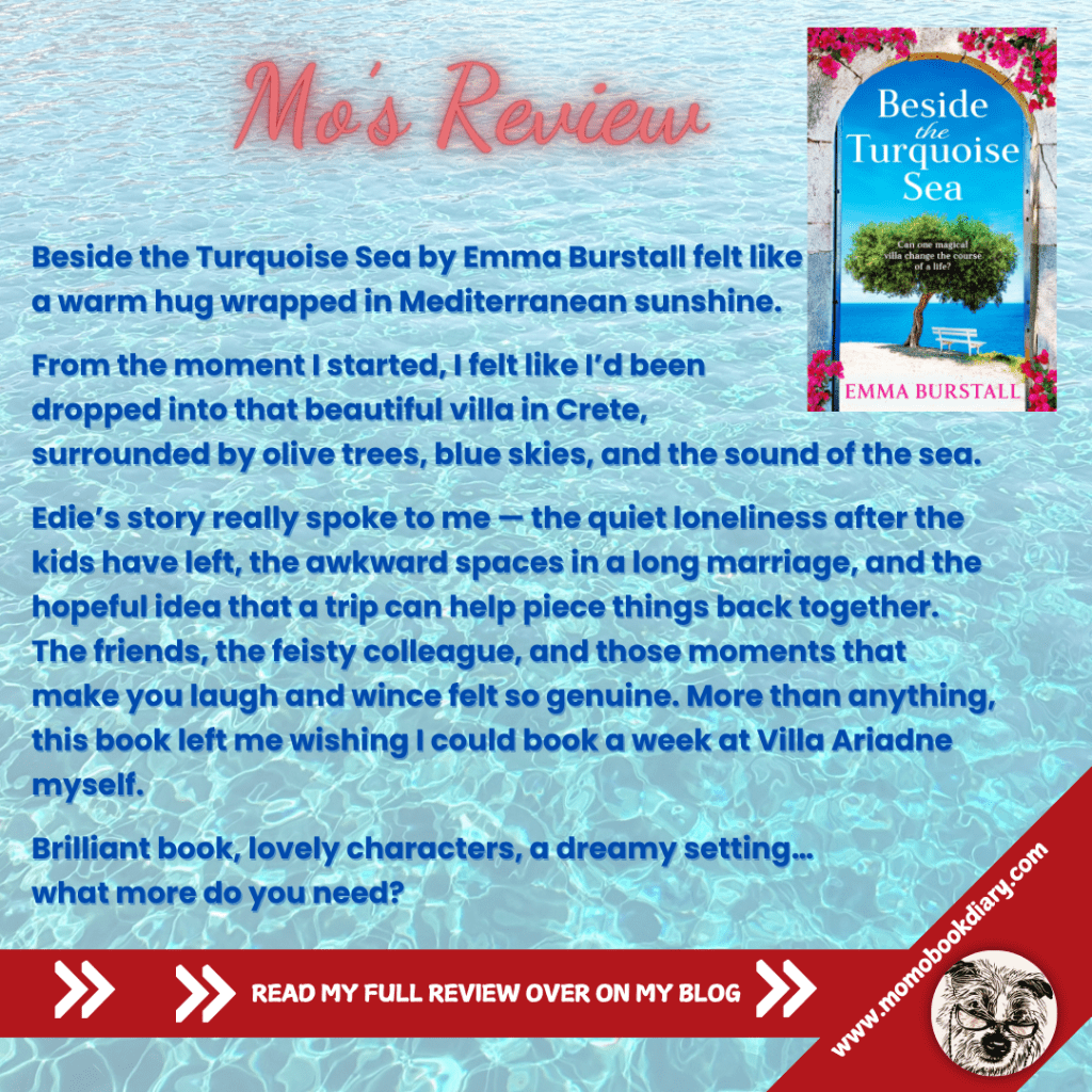 Oh, I absolutely adore the escapes I take with Emma Burstall, and this one felt like a warm hug wrapped in Mediterranean sunshine. From the very first page, I felt as if I’d been dropped straight into that beautiful villa in Crete — surrounded by olive trees, blue skies, and the sound of the sea. It’s a special sort of magic that only this author can create.