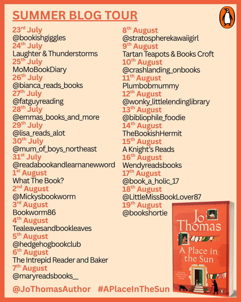 Thank you to Jo Thomas, Transworld, and Zooloo’s Book Tours for the opportunity to read and review an early copy of A Place In The Sun. I’m always grateful to discover new-to-me authors through these opportunities.