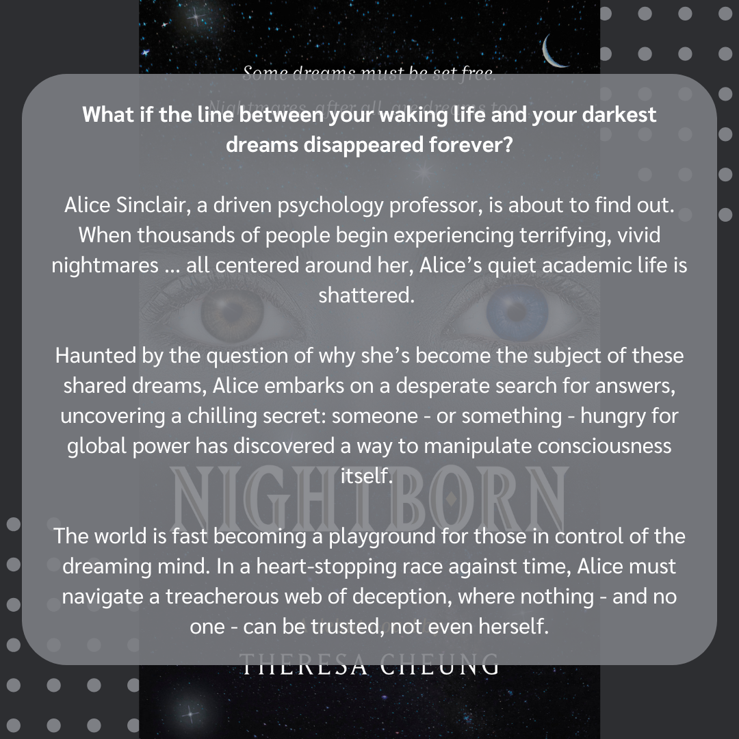NightBorn immediately caught my attention with its premise, and once I started reading, I found myself surprisingly drawn in. This isn’t my typical genre, but the blend of psychology, dreams, and thriller elements created something quite unique. Theresa Cheung’s deep knowledge of dreams and consciousness shines through in a way that feels both accessible and thought-provoking, and it adds a layer of authenticity that sets this story apart.