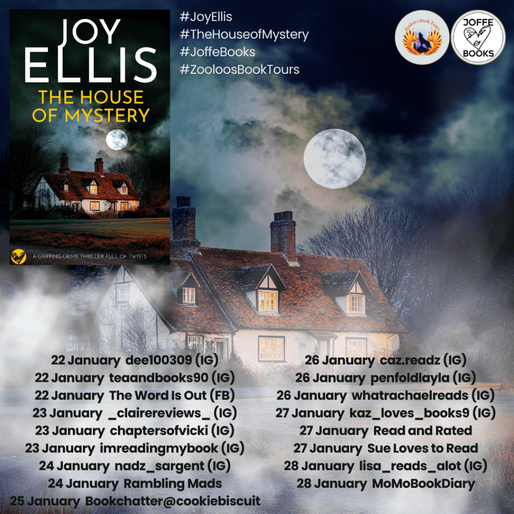 As one of the final stops on the Zooloo’s Book Tours book tour, I’m beyond excited to be sharing my thoughts on The House of Mystery by Joy Ellis. My sincere thanks to Zooloo’s Book Tours and Joffe Books for the opportunity to take part and for supplying a digital review copy.