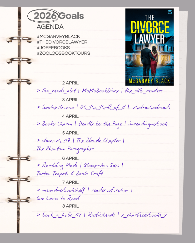 The Divorce Lawyer by McGarvey Black is published by Joffe Books on 2 April 2026 and you can find out more about the book on Amazon, Goodreads and Storygraph